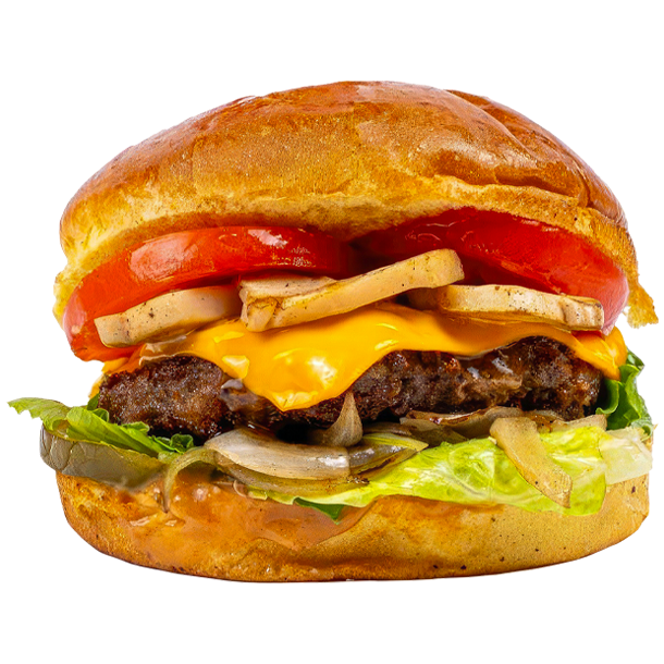 beef patty, cheese, lettuce, mushroom, onions, tomatoes, pickles